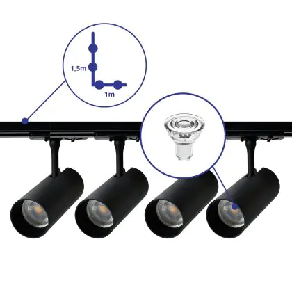 Complete Set 1-Phase Rail L 1 x 1,5 Meter Black | incl. 4x Spot + GU10 2700K 3W Dimmable + End Cap, Power Connector and L -Connector