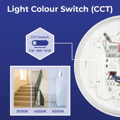 2. CCT: You choose from 2 or 3 fixed colours via a switch, such as warm white or cool white.