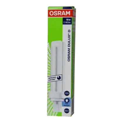 The Osram Dulux D can be used in combination with a conventional ballast. The lamp has a short and compact lamp base type G24d-2. This means that each of these compact fluorescent lamps has a base with 2 pins. The lamps Osram Dulux D 18W 865 has a length of 153 mm.