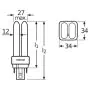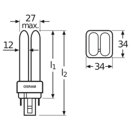 The Osram Dulux D can be used in combination with a conventional ballast. The lamp has a short and compact lamp base type G24q-2. This means that each of these compact fluorescent lamps has a base with 2 pins. The lamps Osram Dulux D/E 18W 865 has a length of 146 mm.