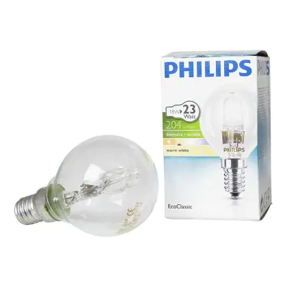 Philips EcoClassic Lustre Clear P45 are halogen lamps suitable for mains voltage. These lamps provide excellent energy efficiency while being dimmable and instantly start up. The lamps have a E14 base, and a P45 shape.